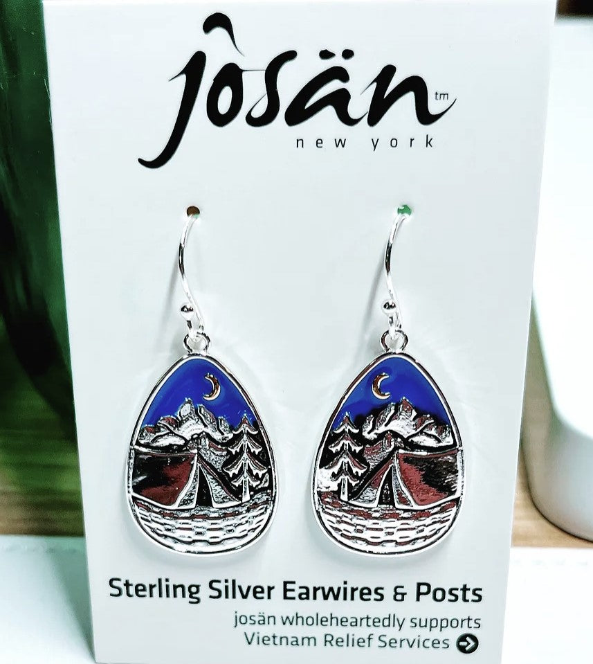 Sterling Silver Earrings with French Hooks Featuring Crescent Moon and Tent with hand painted Blue and Gold Enamel Accents. Measure 3/4 Inch by 1.5 Inches.All sales benefit the Vietnam Relief Services charity, improving the quality of schools in remote parts of Vietnam.