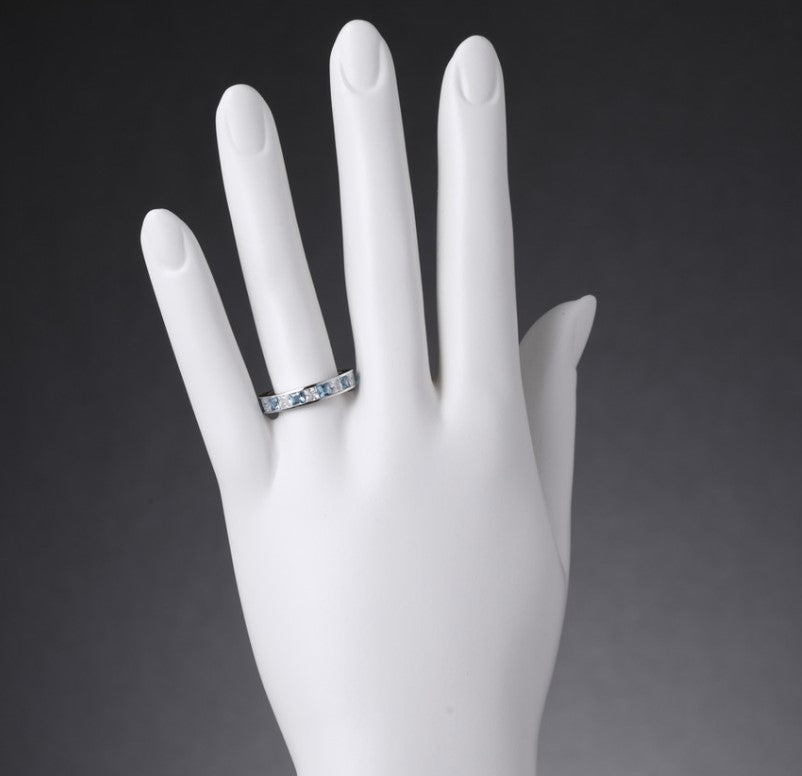 Sterling Silver Rhodium Plated Ring with Six 3mm Square Princess Cut Genuine Swiss Blue Topazes at 1.00 Total Carat Weight and Five 3mm Square Cut Cubic Zirconias. Ring Size 6. Can be ordered in other ring sizes. Please inquire.