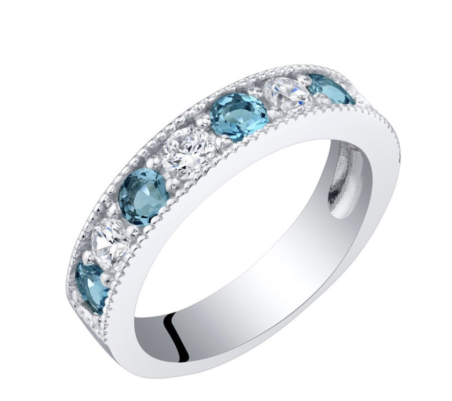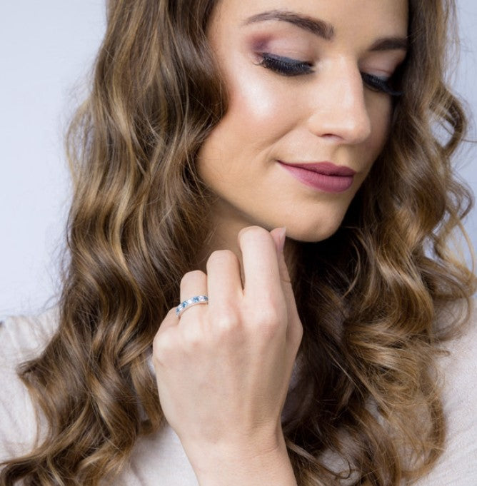 Sterling Silver Rhodium Plated Ring with Five 3mm Round Genuine Swiss Blue Topazes at 0.75 Total Carat Weight and Four 3mm Round Cubic Zirconias. Ring Size 6. Can be ordered in other ring sizes. Please inquire.