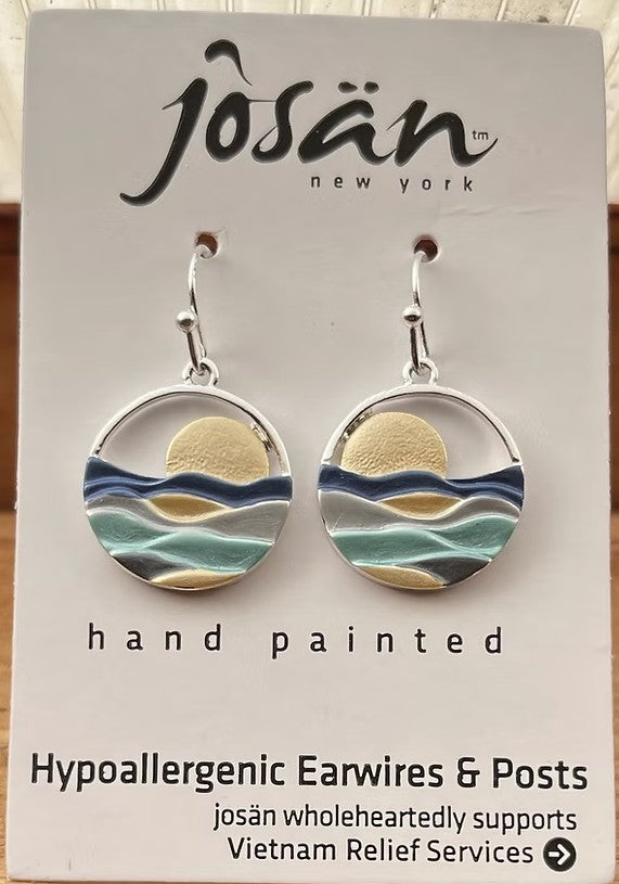 Sterling Silver and Rhodium Plated Earrings with French Hooks Featuring Brushed Matte Colored Enamel and Hand Painted Gold Accents. Earrings Measure Approximately 1.25 Inch by 0.75 Inch.Each purchase benefits the Vietnam Relief Services charity, improving the quality of schools in remote parts of Vietnam.