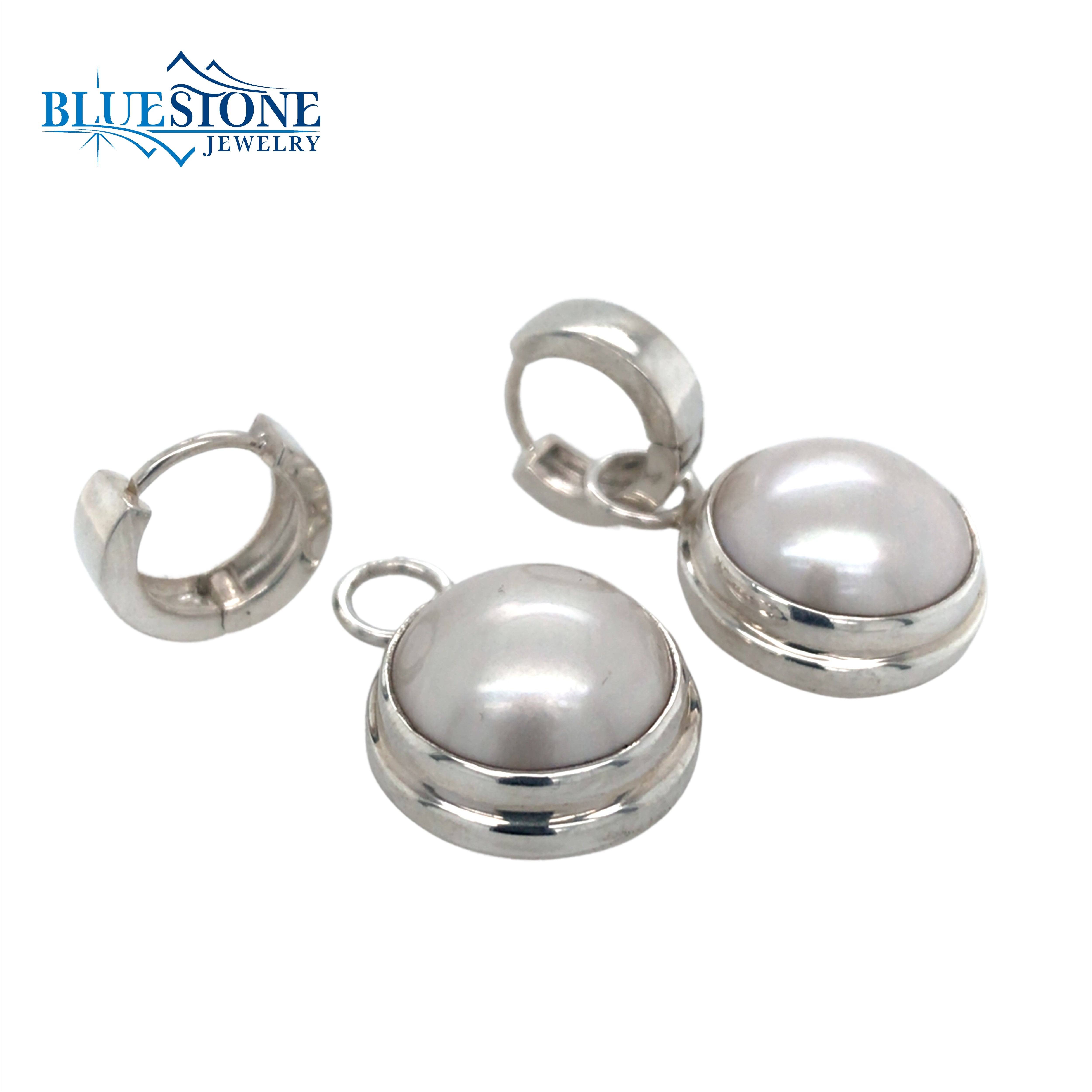 Sterling Silver Huggy Earrings with Two 13mm Wide Mabe White Freshwater Pearls. Measure Approximately 1.5 Inches Long. Pearls can be removed and huggies can be worn separately.Local Lake Tahoe Designer.