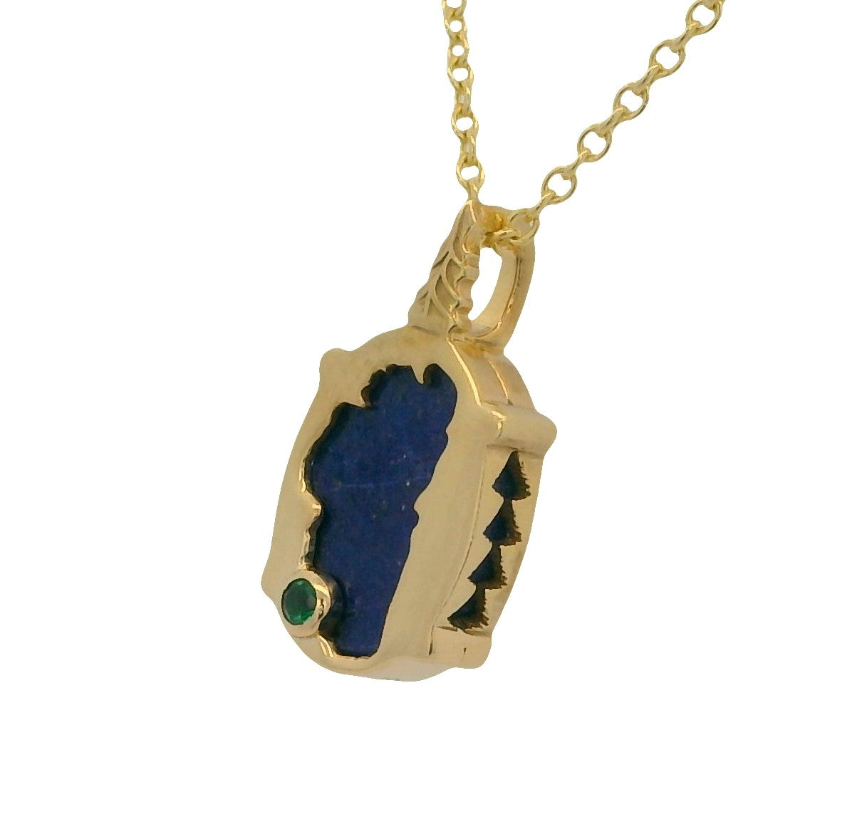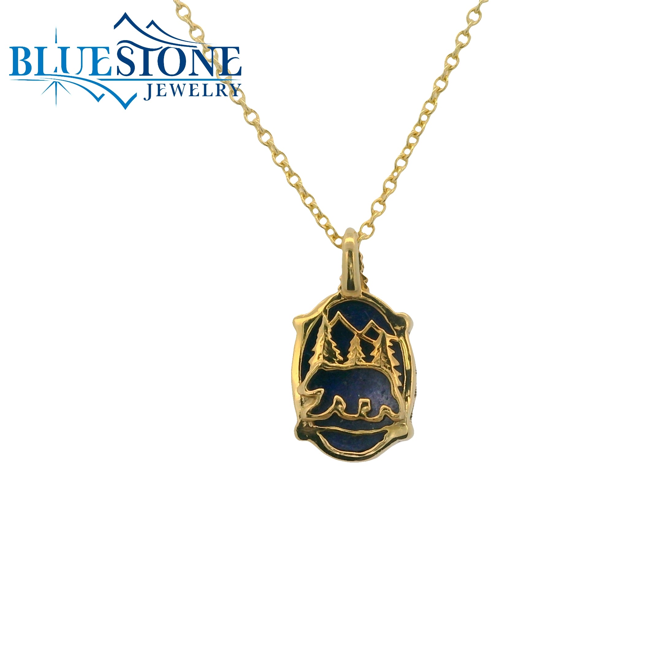 Sterling Silver with 14 Karat Yellow Gold Plating Small Lake Tahoe Reversible Bear Pendant with Lapis and Created Emerald. Chain sold separately.