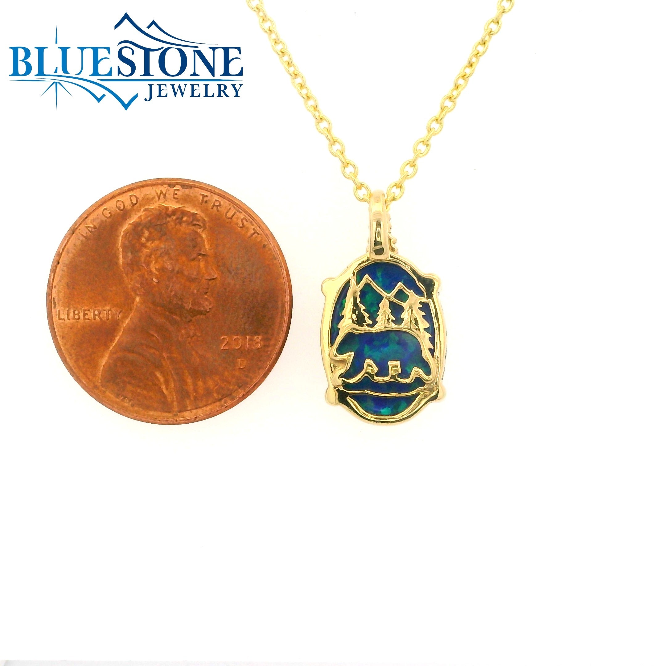Sterling Silver with 14 Karat Yellow Gold Plating Small Lake Tahoe Reversible Bear Pendant with Lab Grown Opal and Created Emerald. Chain sold separately.