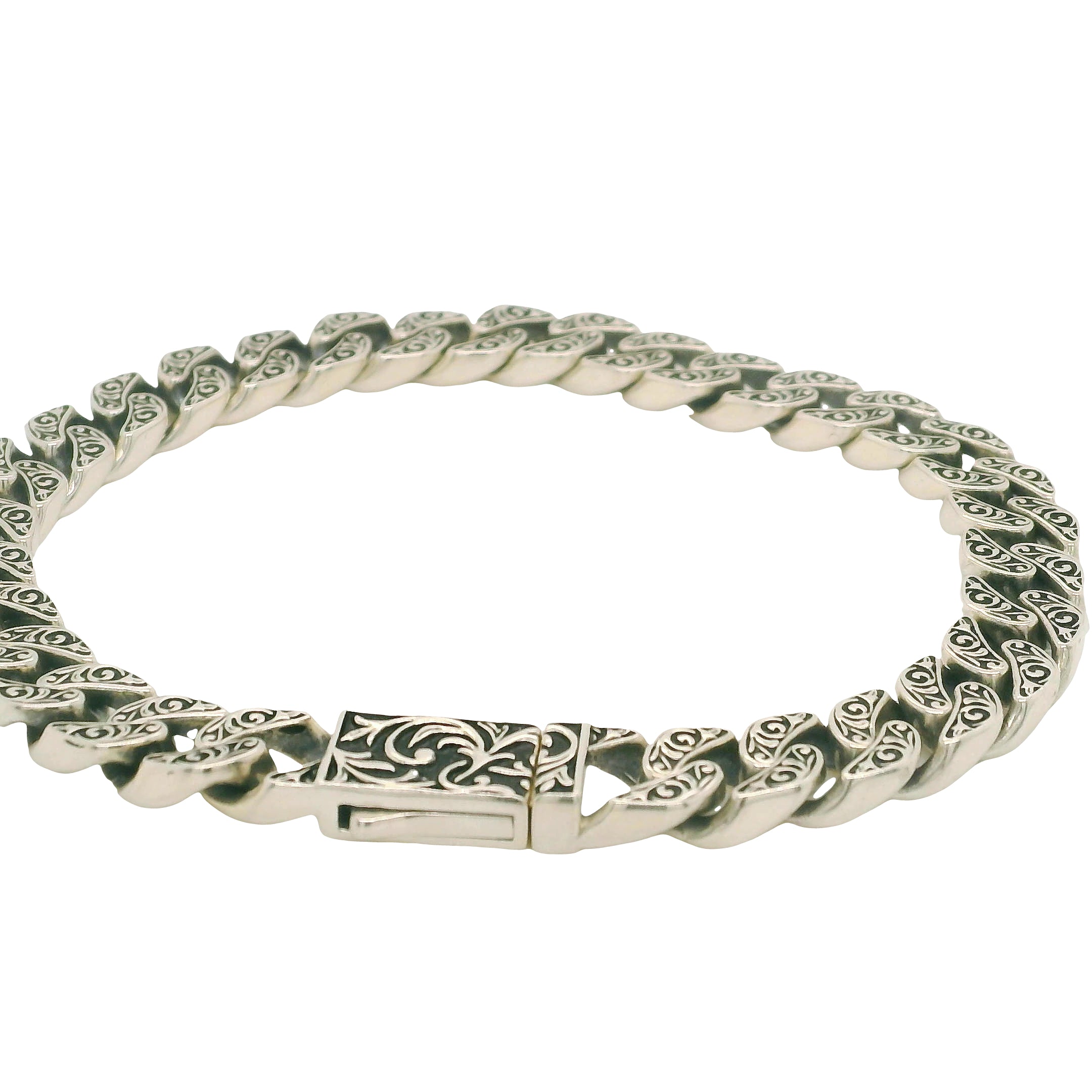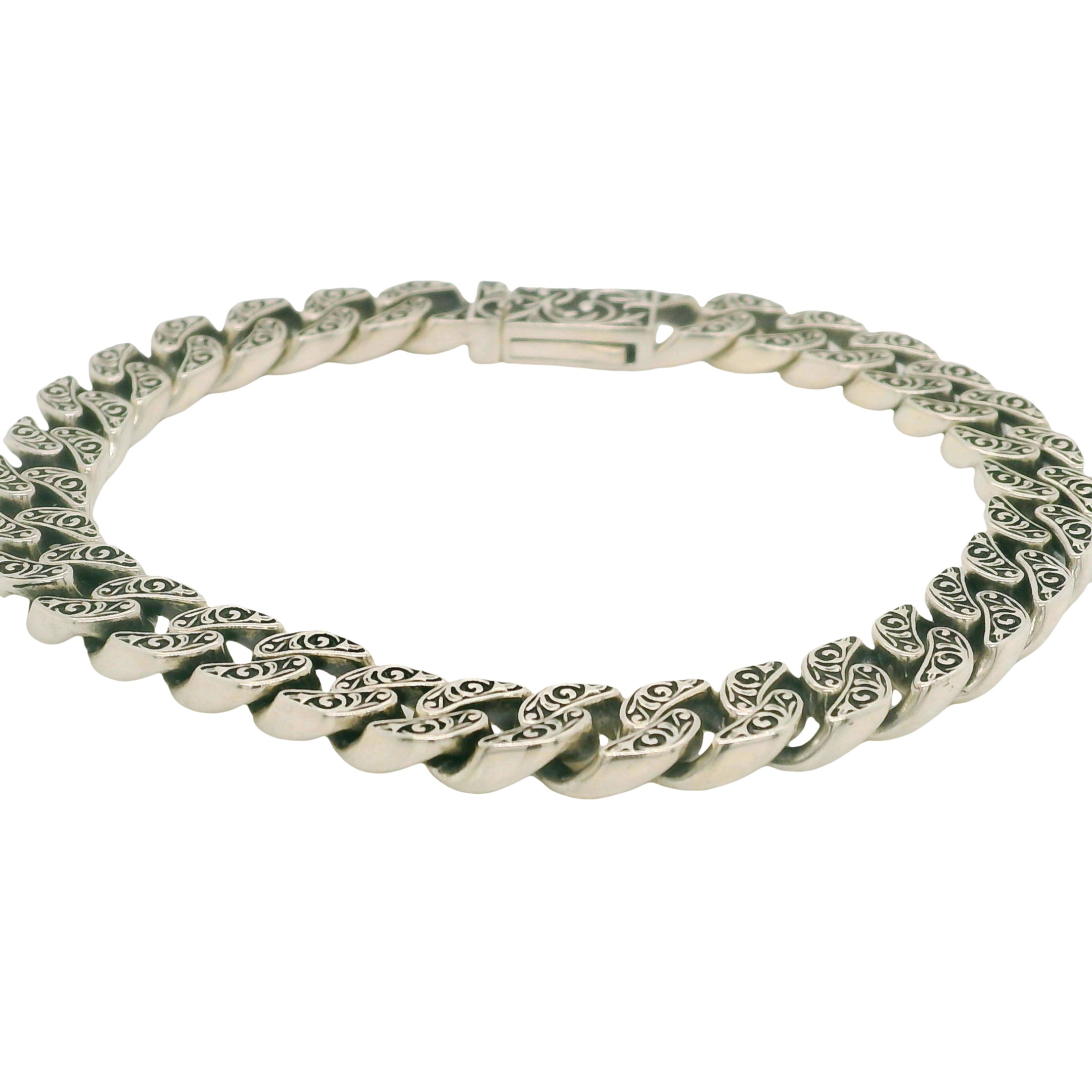 Sterling Silver with rhodium plating curb chain bracelet with scroll pattern featuring black oil detailing. 7.5"