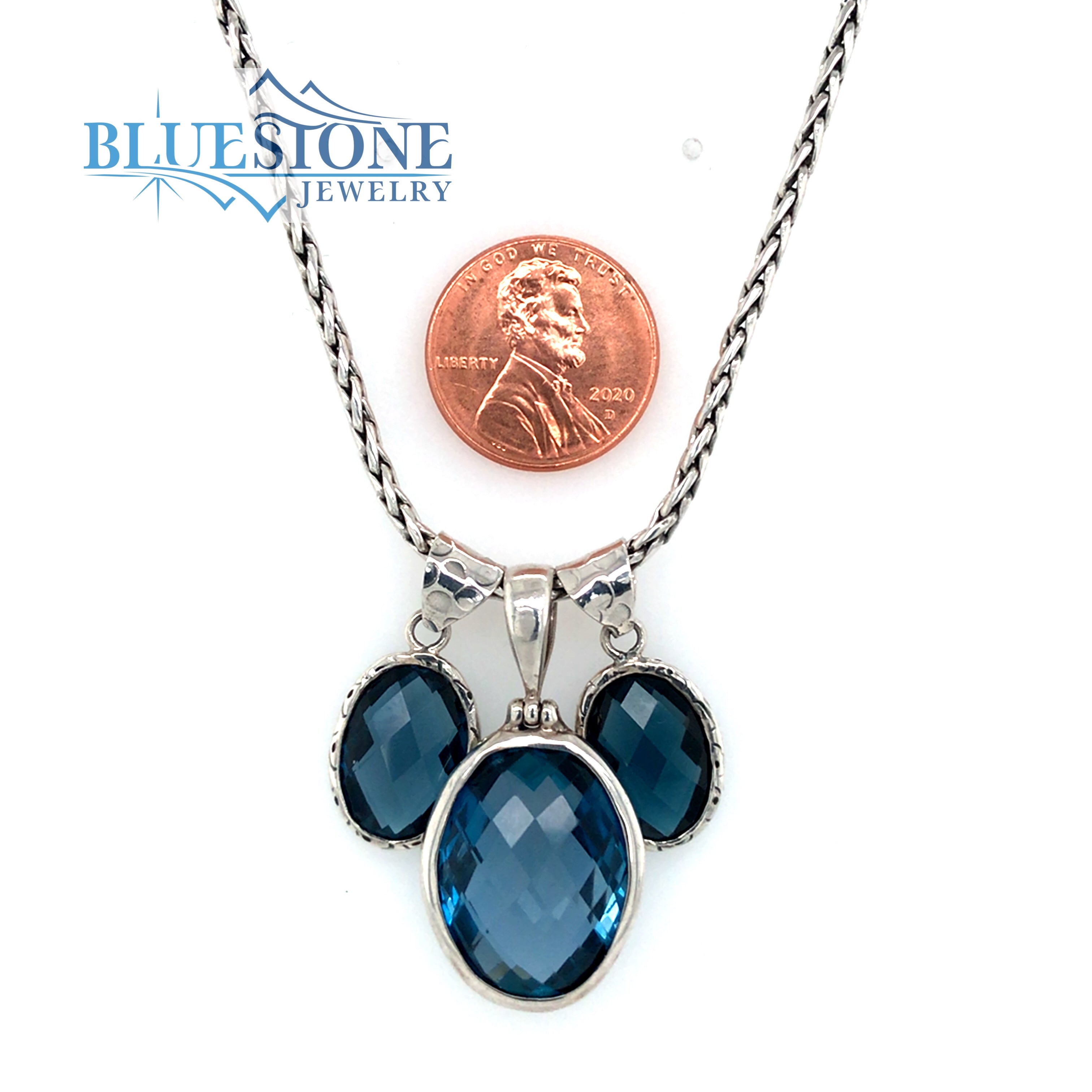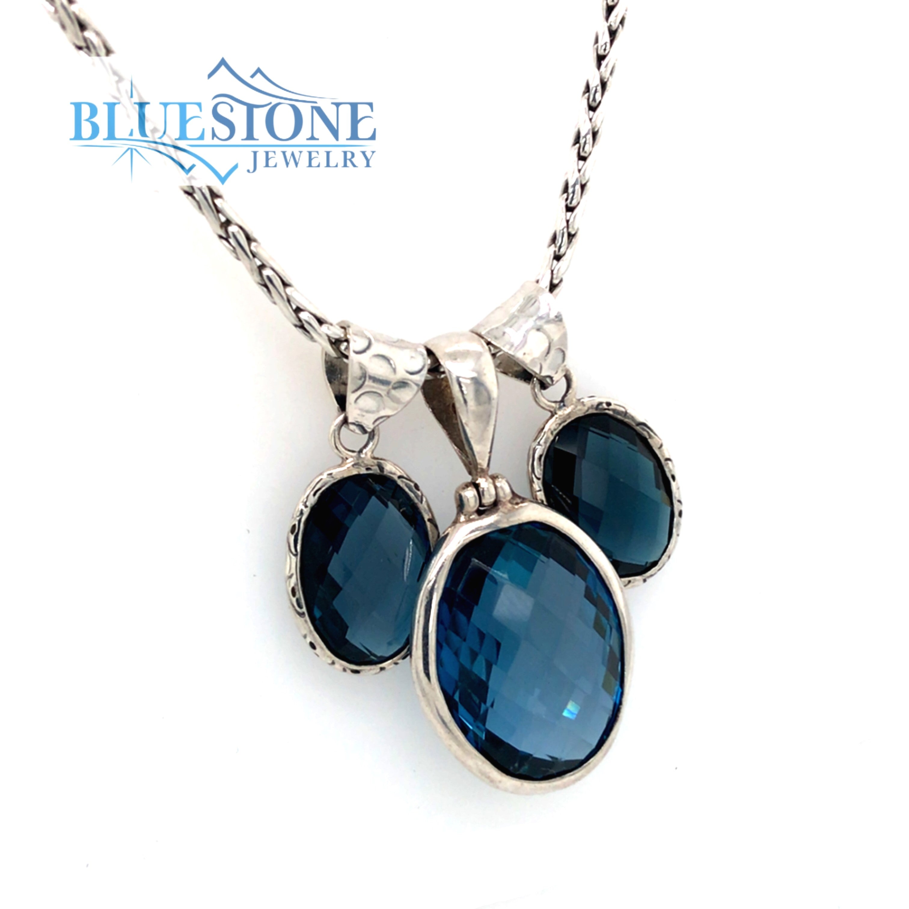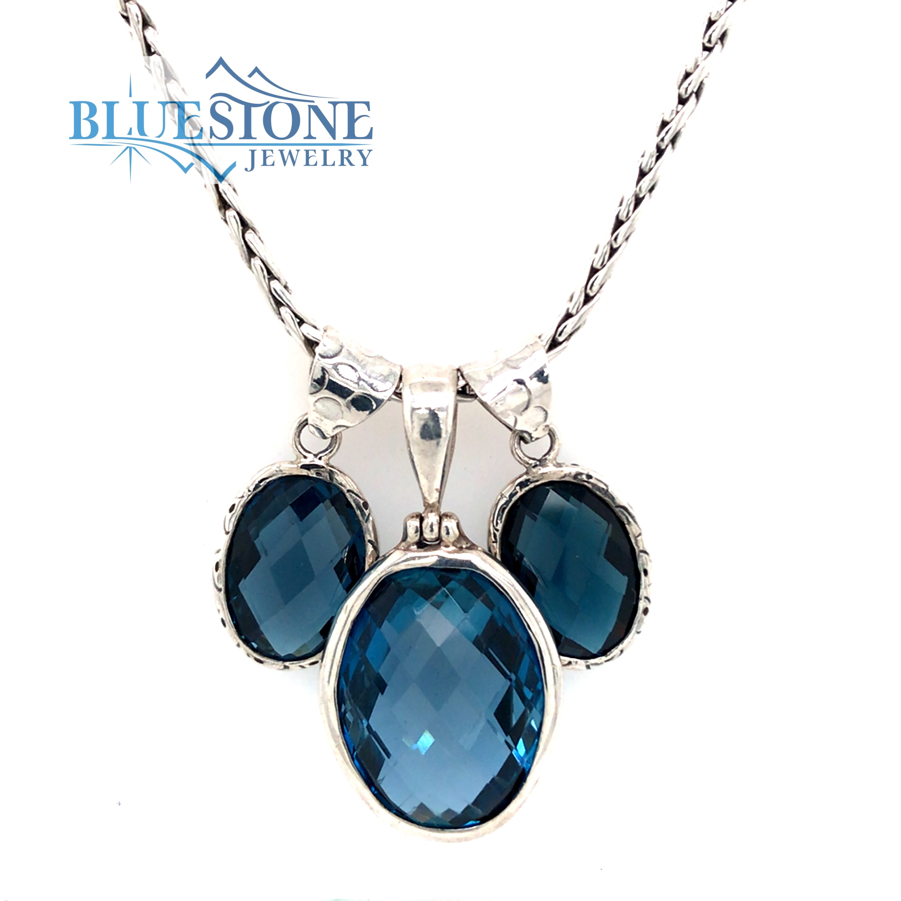 Three Sterling Silver Pendants with One 5/8" x 6/8" Oval Cut London Blue Topaz and Two 3/8" x 1/2" Oval Cut London Blue Topazes. Comes on a 2.1mm Wide Petite Weight Handwoven Sterling Silver Chain, 19 Inches. Pendants can be removed and worn separately. Local Lake Tahoe Designer
