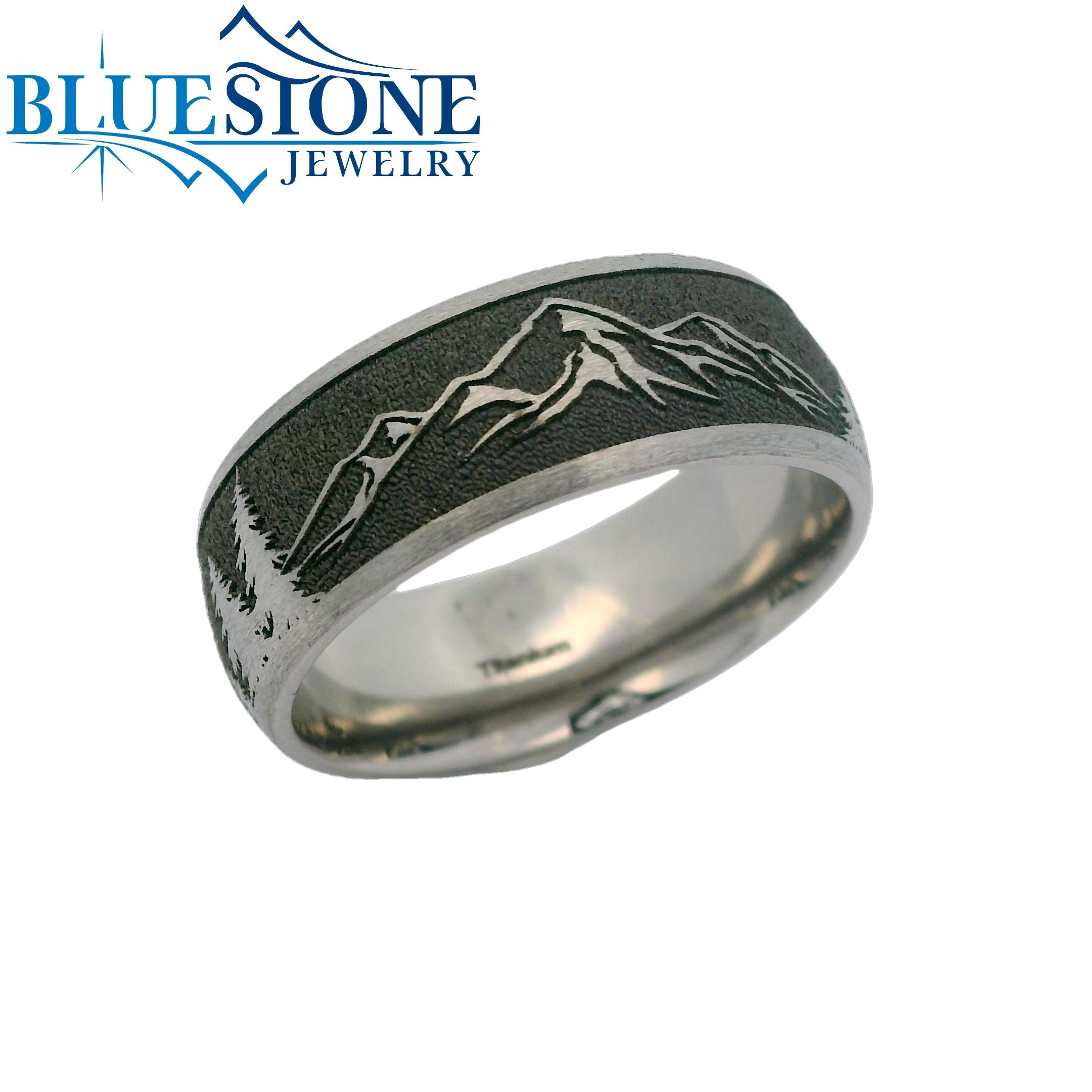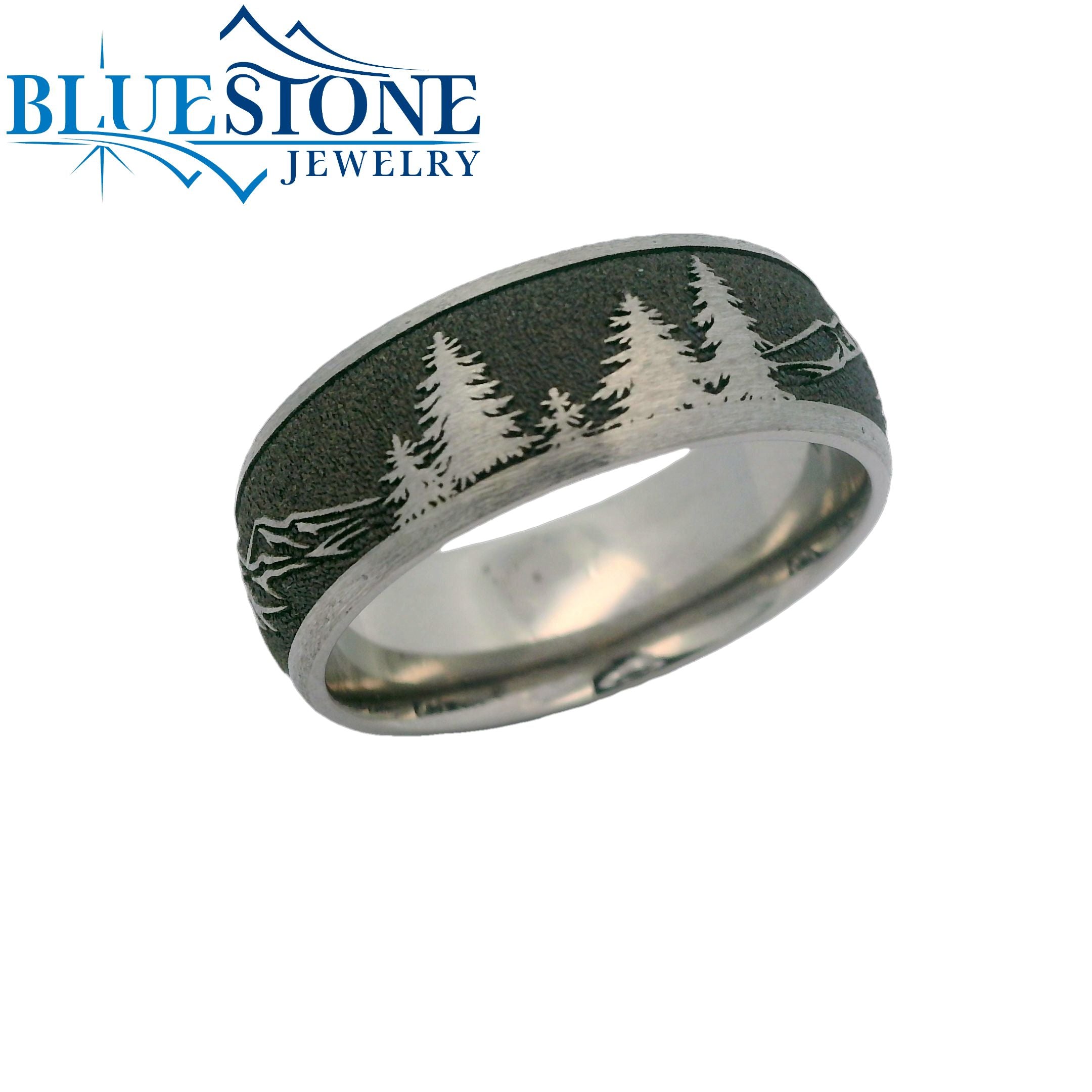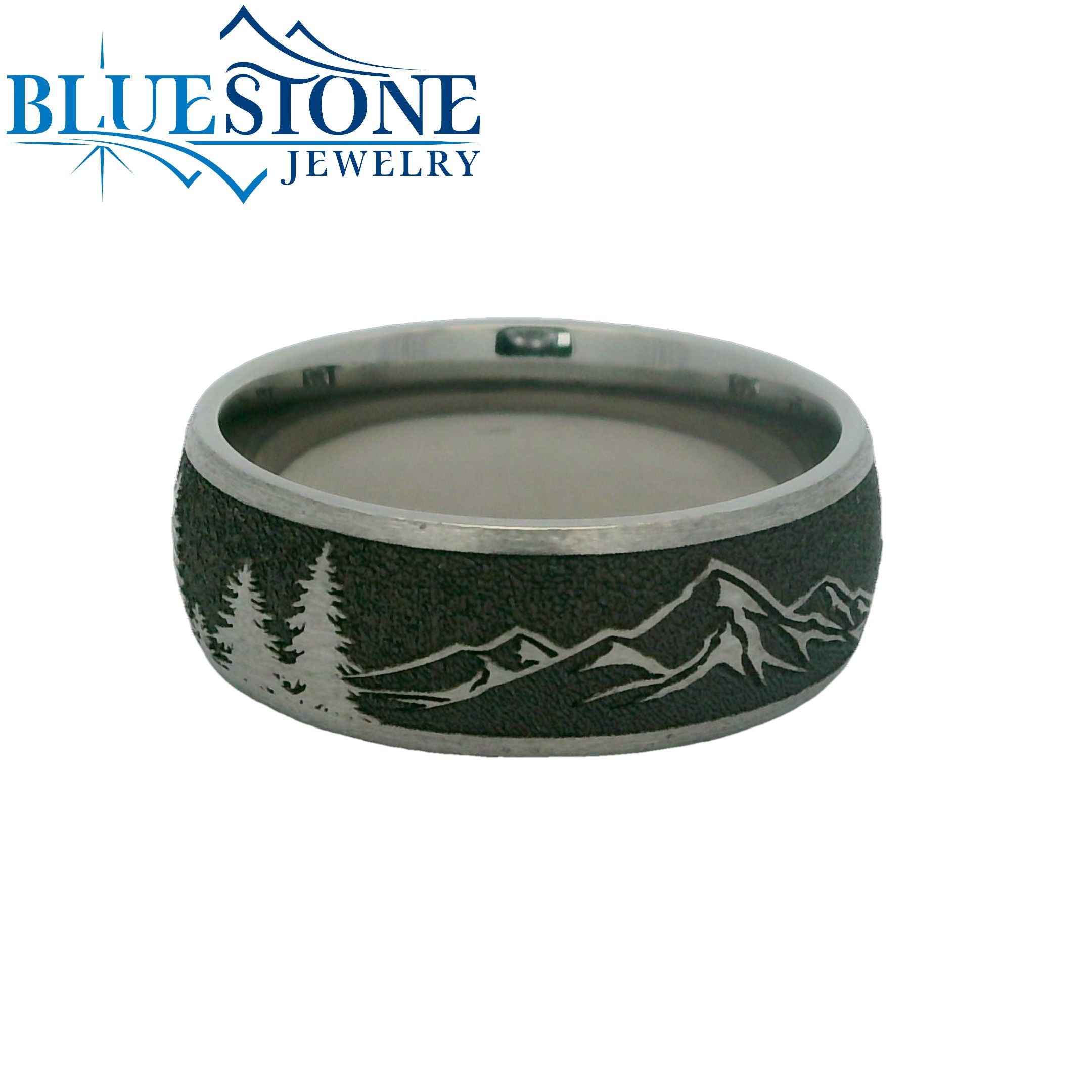 8mm Titanium Domed Band with Truckee Tahoe Mountains and Trees. Stone finish.Ring Size 10***Can be made to order in different wood inlay options, width options, ring sizes, metal options. Prices will vary***
