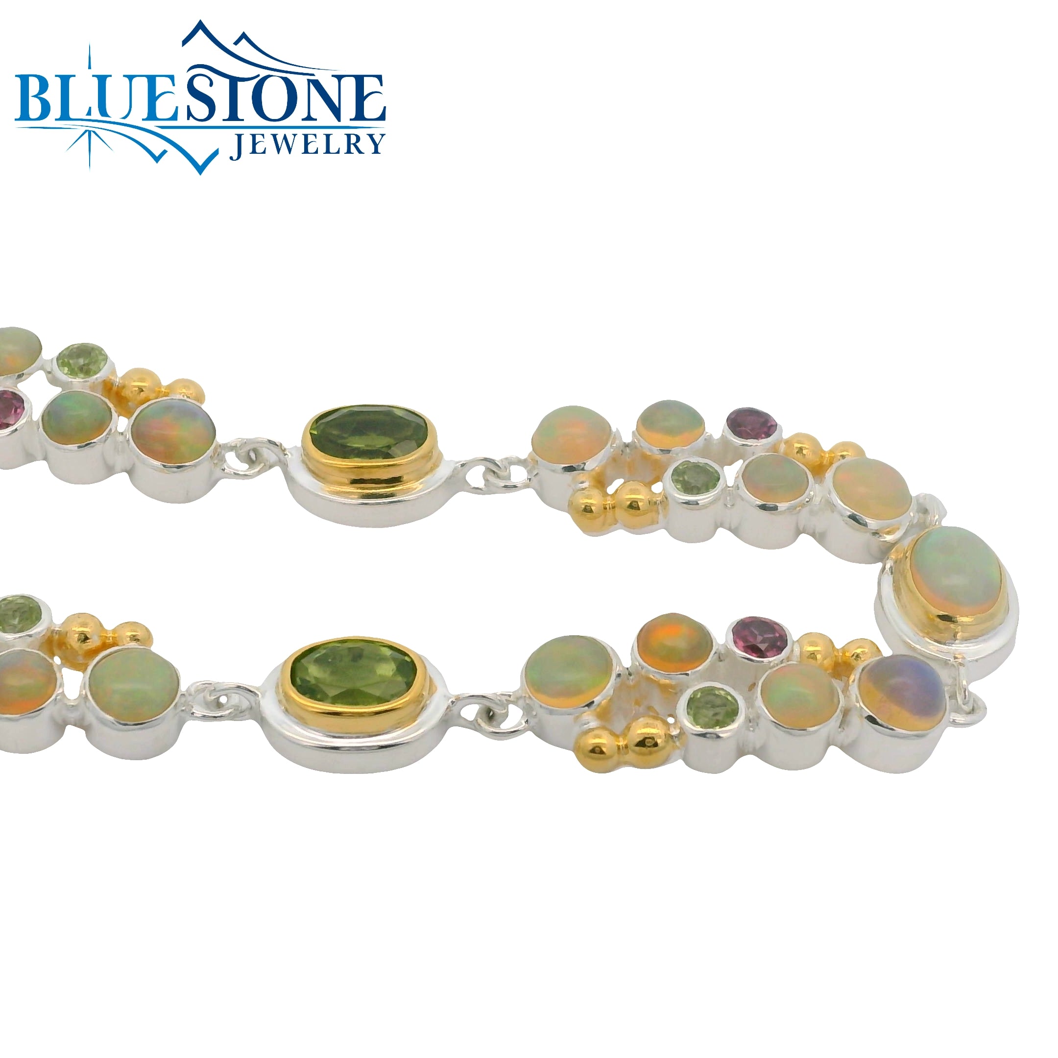 Sterling Silver and 22 Karat Yellow Gold Vermeil Bracelet with 18 Ethiopian Opals, 6 Peridot and 4 Rhodolite Garnets Gemstones. Bracelet Measures 7.5 Inches Long. Local Lake Tahoe Artist Michou.