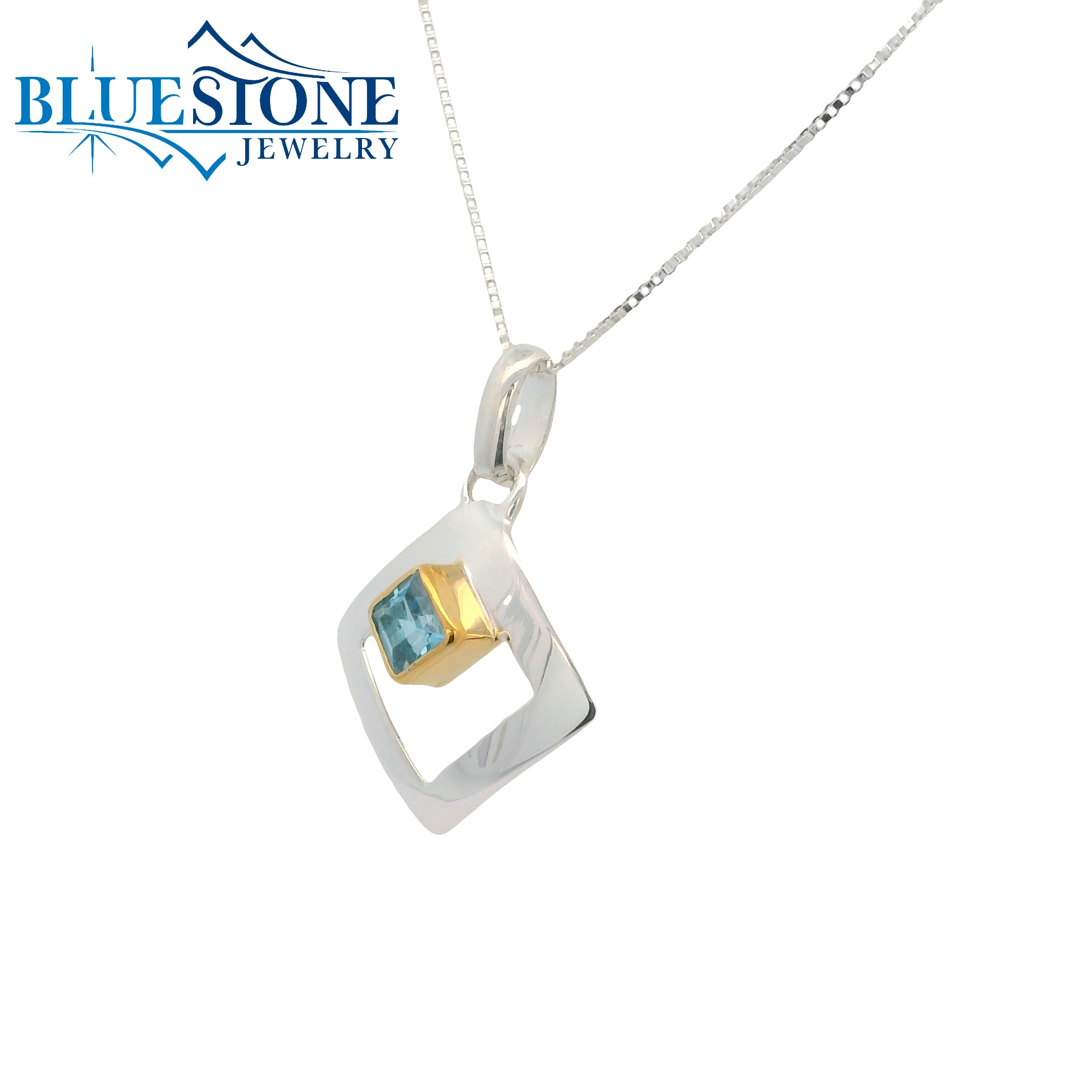 Sterling Silver and 22 Karat Yellow Gold Vermeil Concave Square Outline Pendant with One Princess Cut Sky Blue Topaz. Pendant Comes on an 18 Inch Sterling Silver Box Chain. Pendant Measures Approximately 1 Inch Long. By Local Lake Tahoe Designer Michou!
