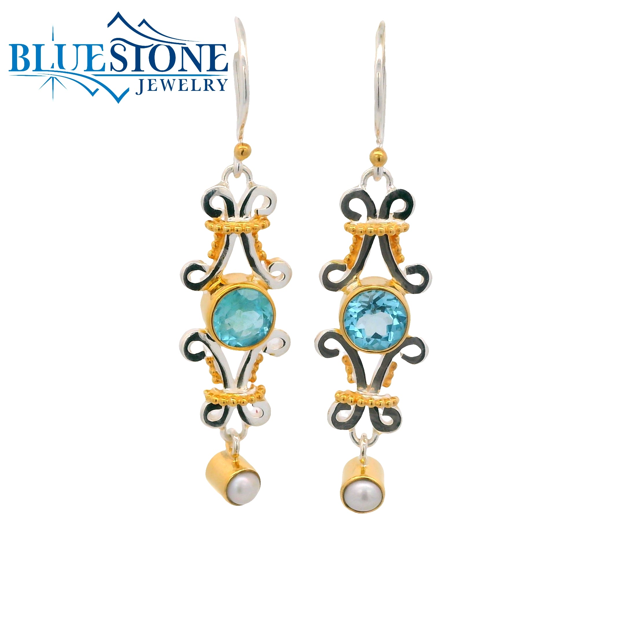 Two-Tone Earrings with Blue Topaz & Pearl Gemstones