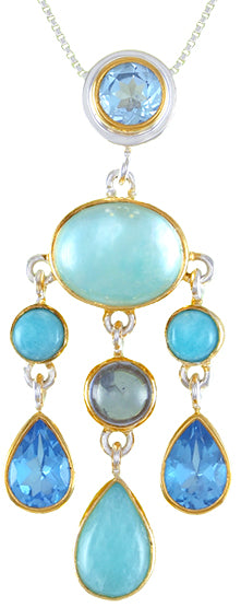 Two-Tone Sterling Silver & 22 Karat Yellow Gold Vermeil Necklace with Mother of Pearl between a slice of Amazonite and Quartz, Sky Blue Topaz, Amazonite and Paraiba Topaz. Comes on an 18" Sterling Silver Box Chain.By local Lake Tahoe designer Michou!