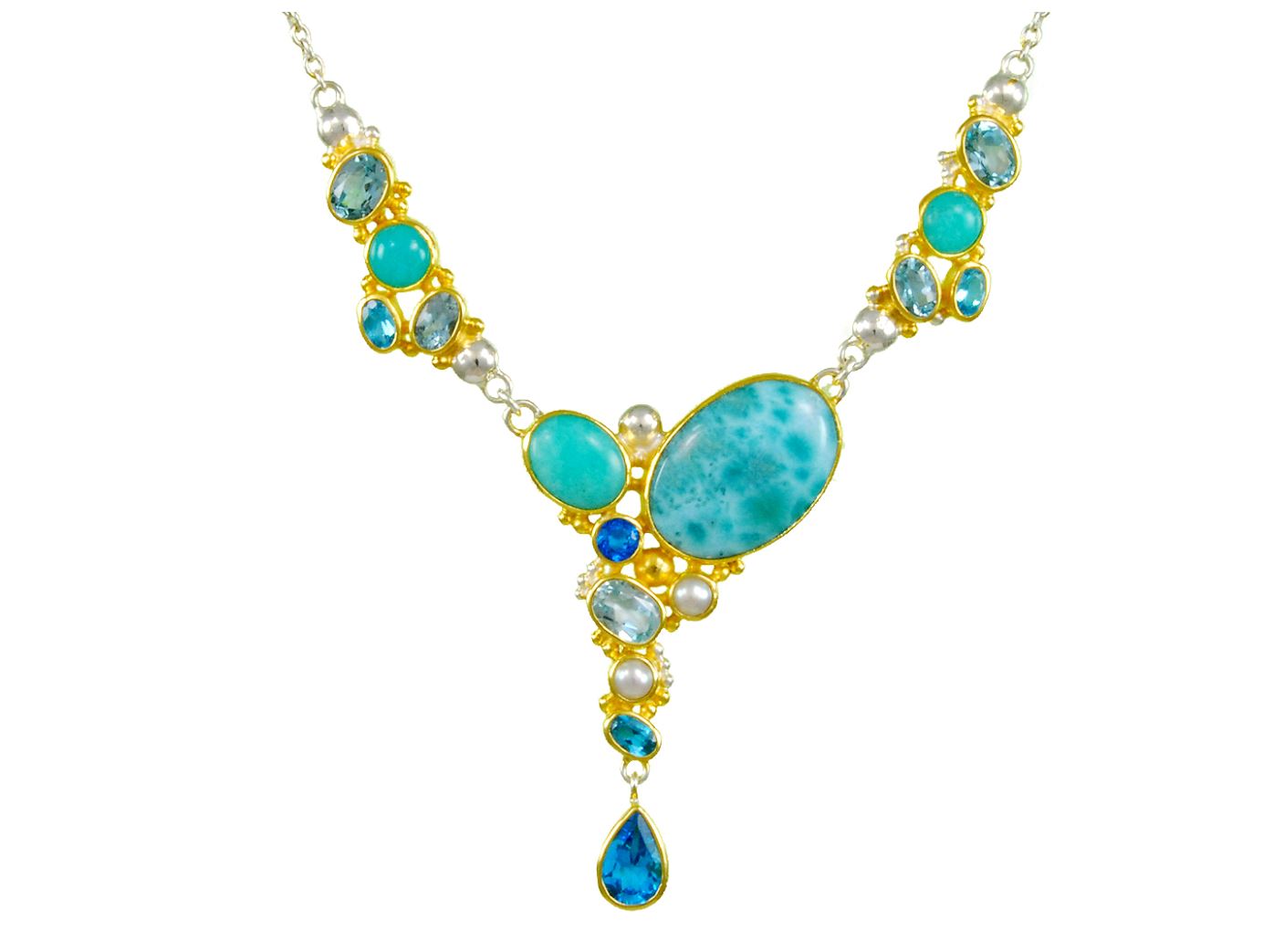 Two-Tone Sterling Silver & 22 Karat Yellow Gold Vermeil Necklace with 2 Oval Blue Topaz, 5 Oval Cut Sky Blue Topaz, 3 Teal Topaz, 3 Amezonites & a Cabochon Cut Larimar 18 inches in lengthBy local Lake Tahoe designer Michou!