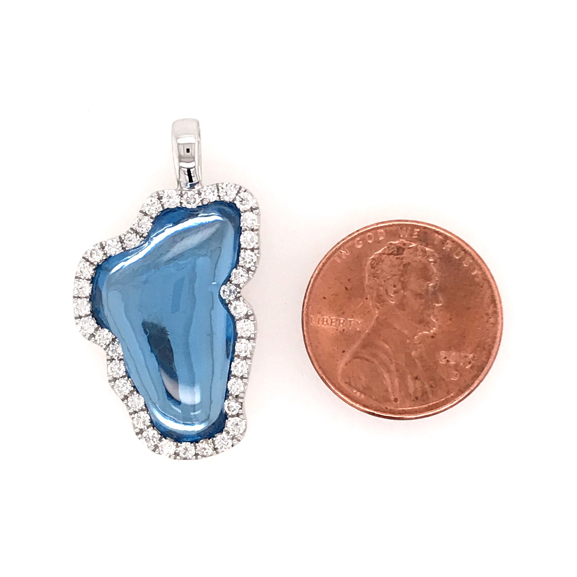 Extra Large 14 Karat White Gold Lake Tahoe Outline Pendant with a 10.10 Carat Hydro Blue Topaz and 37 Round Diamonds at 0.68 Carats Total Weight of G Si1 Quality Diamonds. Backed with 14 Karat White Gold to Enhance the Brilliant Color of the Hydro Blue Topaz. Pendant Measures 0.75 Inch by 1.25 Inches.Exclusive Bluestone Jewelry Collection.Chain is Sold Separately. Comes on an 18 inch metal alloy DISPLAY chain.