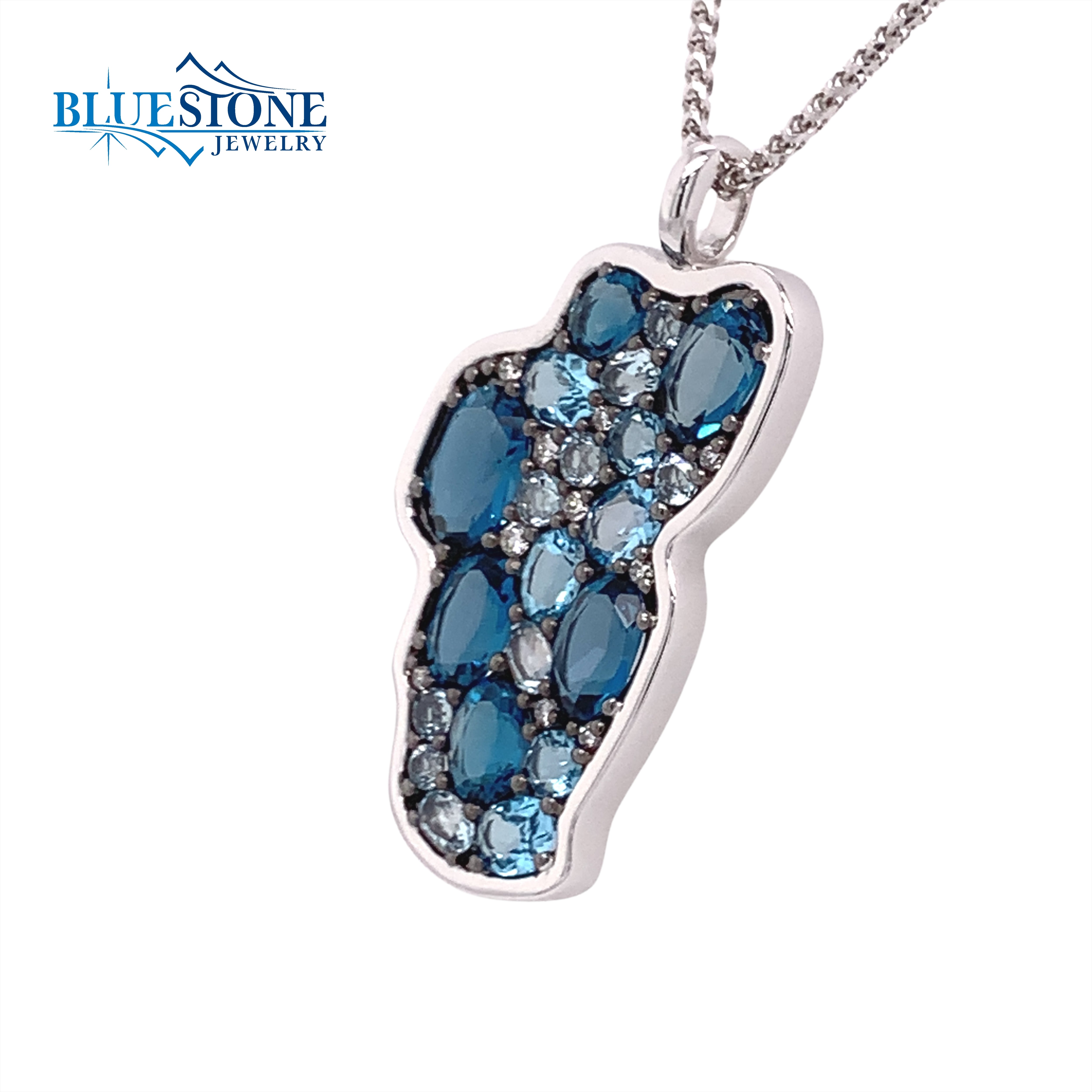 14 Karat White Gold Extra Large Lake Tahoe Pendant with 21 variety of colors of London Blue Topaz, Swiss Blue Topaz and Sky Blue Topaz gemstones at a total weight of 4.51 Carats and 10 Round Diamonds at 0.07 Carats Total Weight G SI1 quality.Comes on Base Metal Display Chain. Chains are Priced Separately.